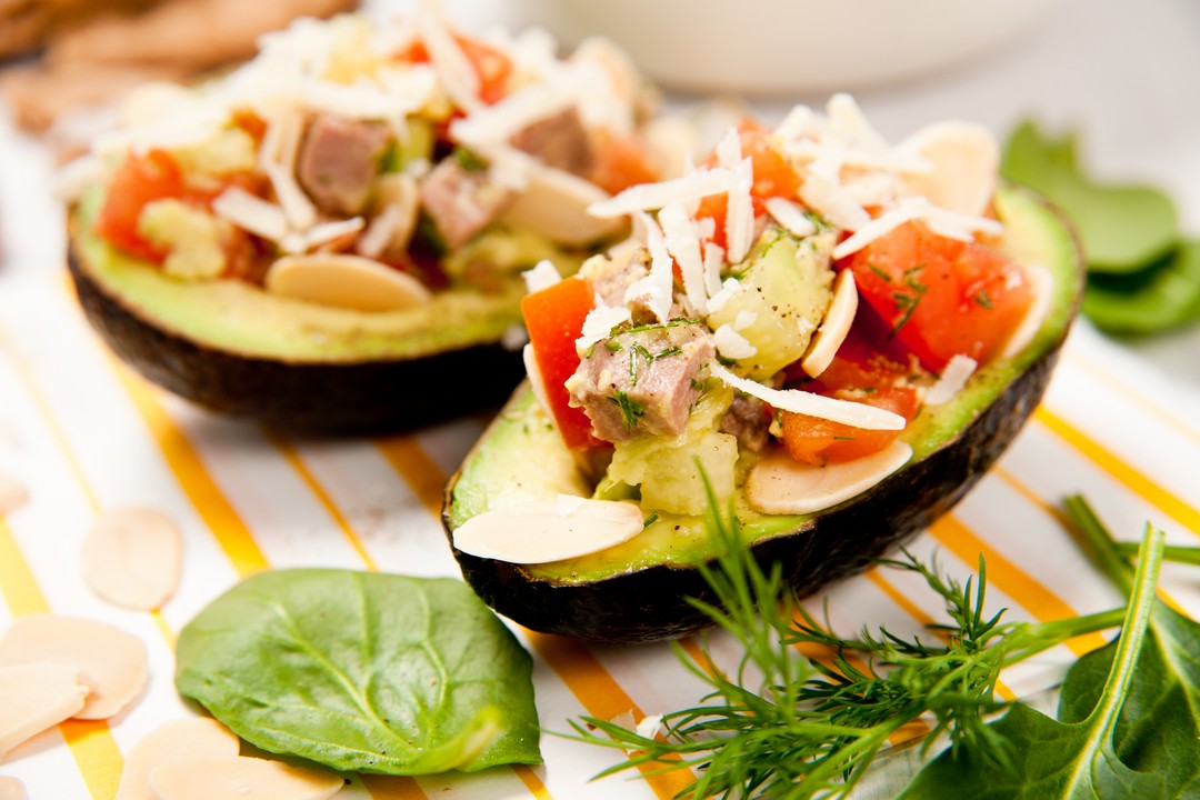Luego, abrir los aguacates a lo largo por la mitad, retirar las semillas y quitar un poquito de la masa con una cucharita para que el hueco esté un poco más grande.