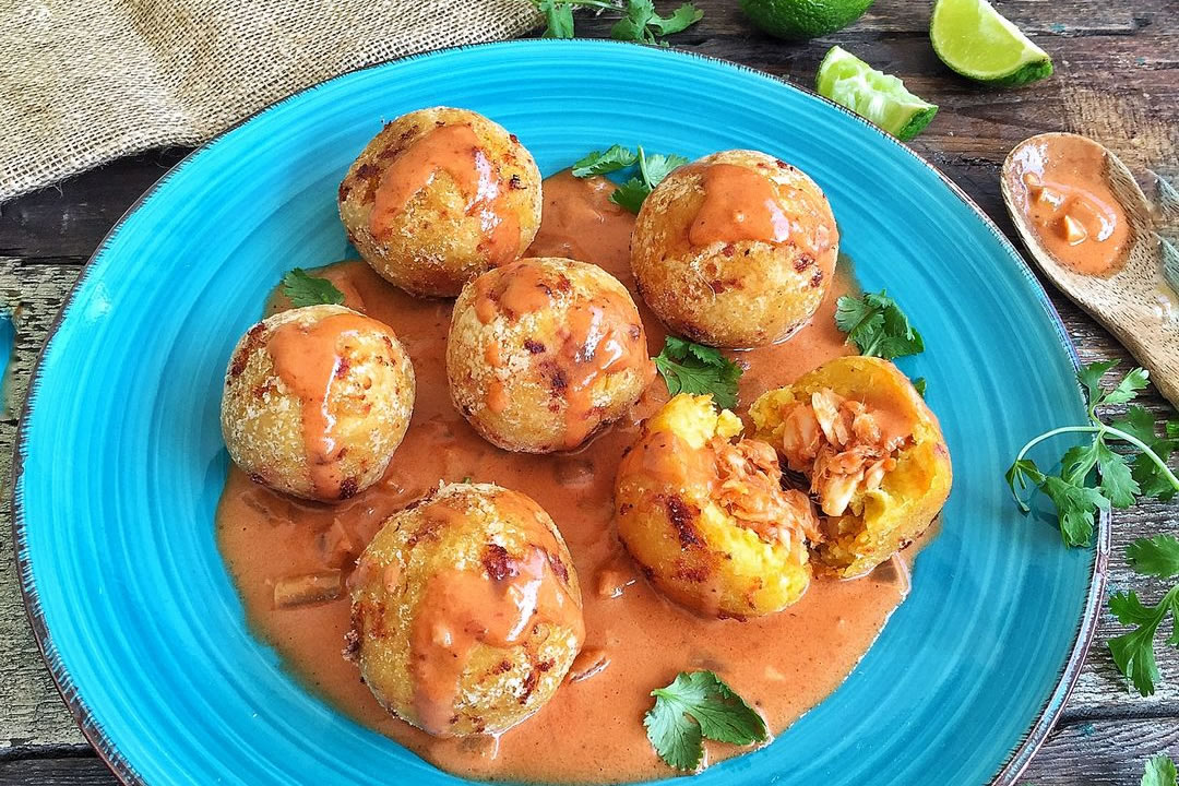- Para realizar las albóndigas tomar un poco de puré, abrir un hueco en el centro y rellenar con la mezcla del bacalao y una pasa.