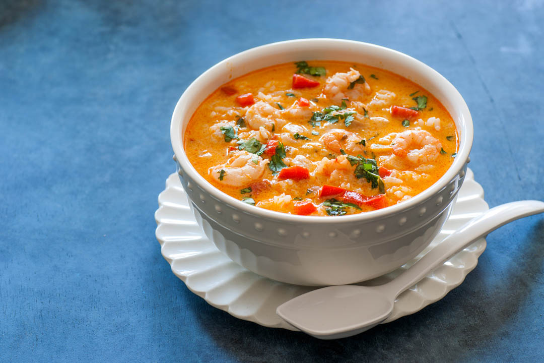 Agregar los camarones pelados y el apio y sofreír por unos segundos. Agregar la mitad del agua y dejar hervir.