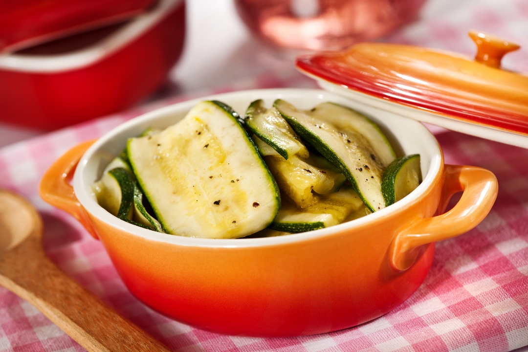 - Ponemos los calabacines en un pyrex y los sazonamos con aceite verde, ajo triturado, sal y pimienta.