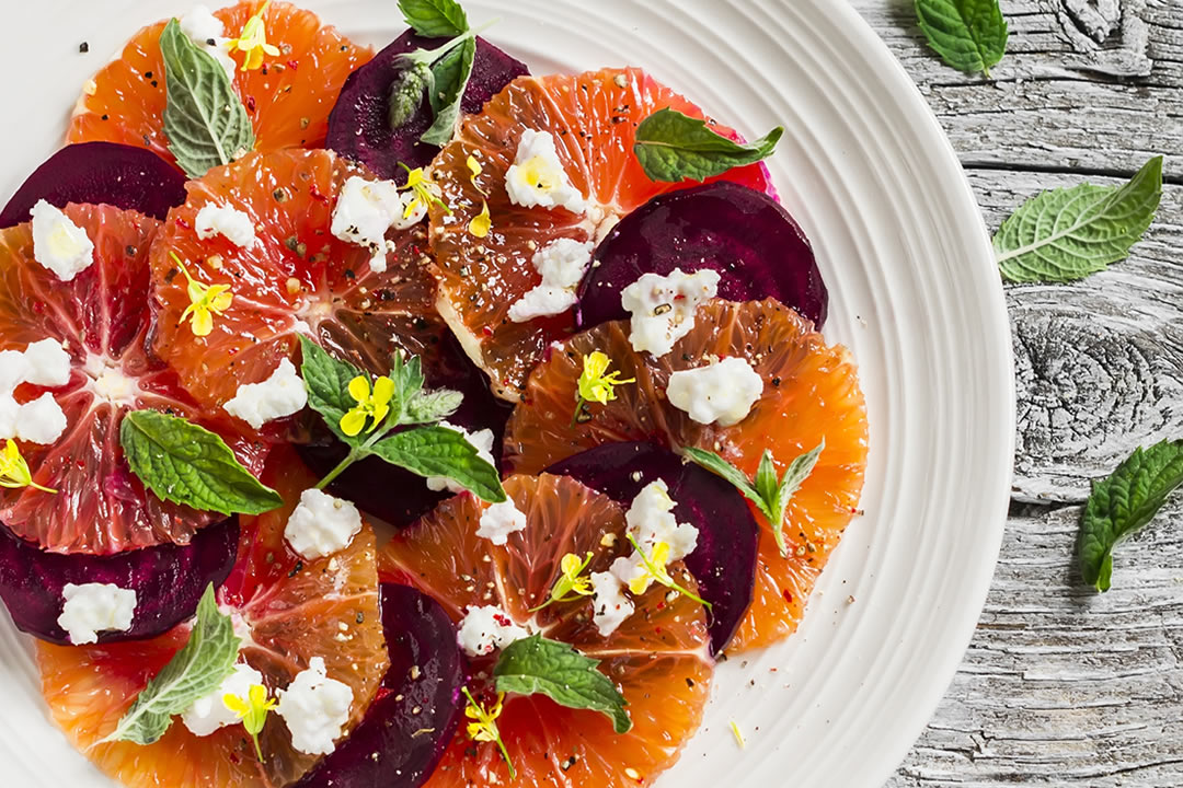 Colocamos las laminas de la remolacha en un plato, intercalada con laminas muy finas de naranja, agregamos la cebolla laminada.