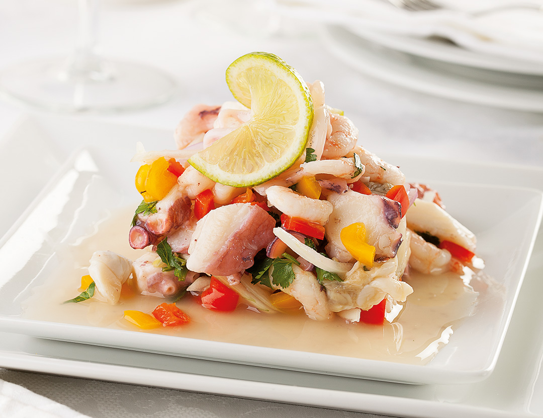 Agregamos los camarones cocidos al pescado, seguido del cilantro picadito, la cebolla y el pimiento rojo. Por último las almejas y calamares. Mezclamos bien y servimos.