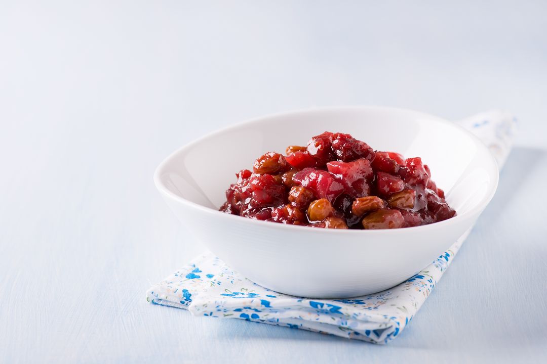 - Agregar con cuidado los cranberries, las manzanas, la cebolla, las pasas, el azúcar crema, el vinagre, la canela, sal, malagueta y clavo dulce