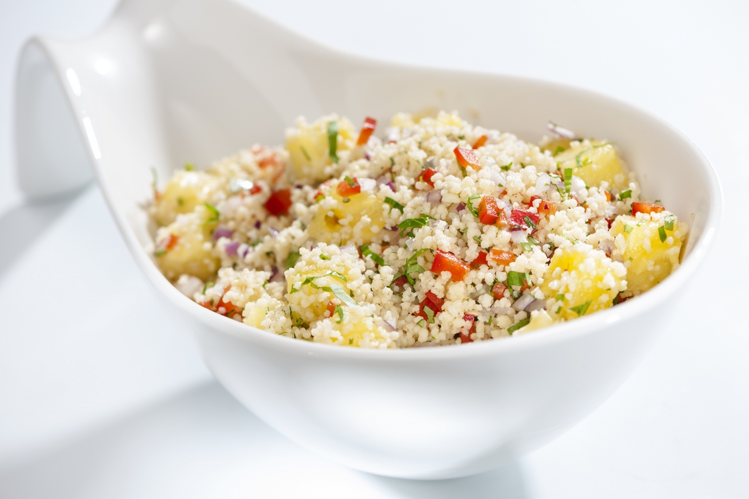 En un recipiente colocamos el cous cous (cocido previamente según instrucciones del empaque) y agregamos la cebolla amortiguada*, el cilantro, el perejil picadito, la piña cortada en cubos medianos, el pimiento morrón rojo y la rúcula, y agregamos sal y pimienta al gusto.