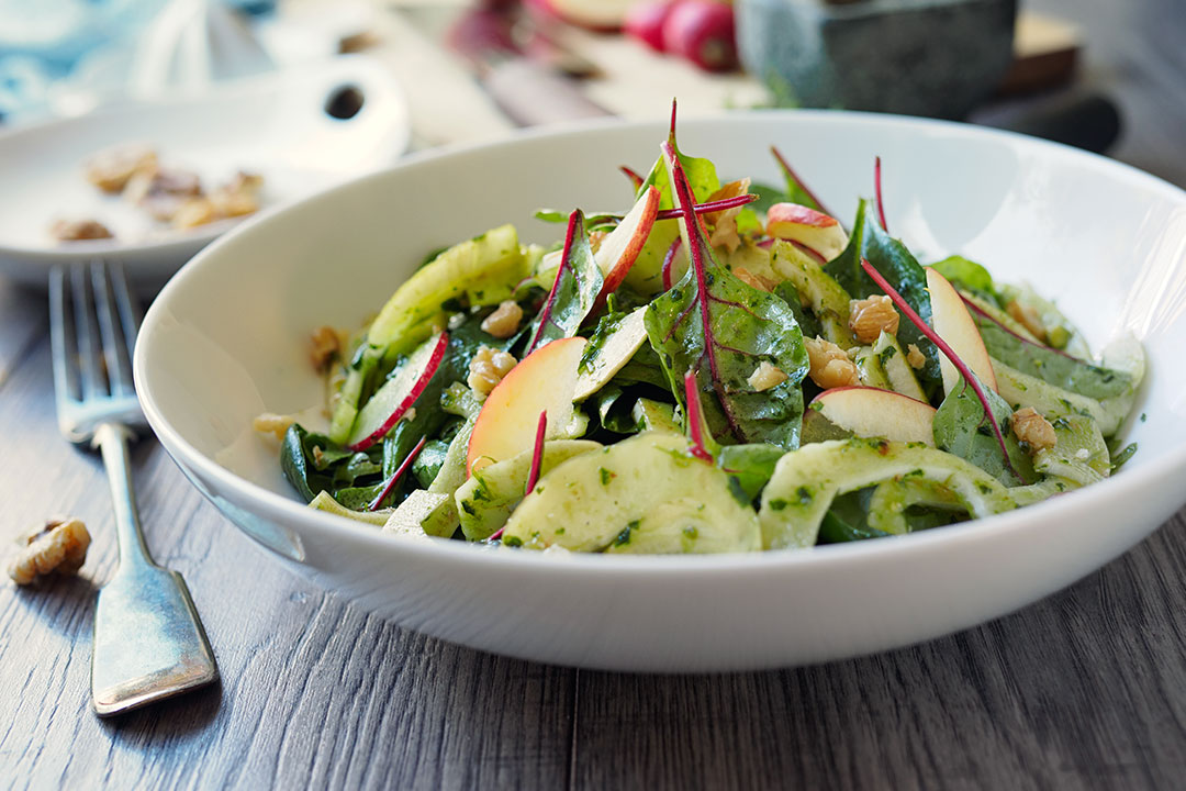Incorporar este aderezo a las hojas de rúcula (lavadas y secas) y por arriba agregar la manzana picadita (bañar con un poco de limón para evitar que se oxiden), las nueces, los cranberries y las semillas de girasol.