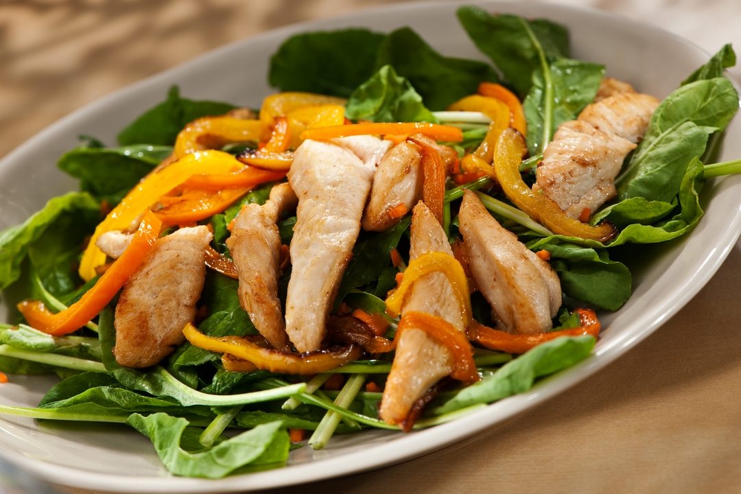 - Colocamos en un platón la rúcula, albahaca, pimiento cortado en julianas y el pollo.