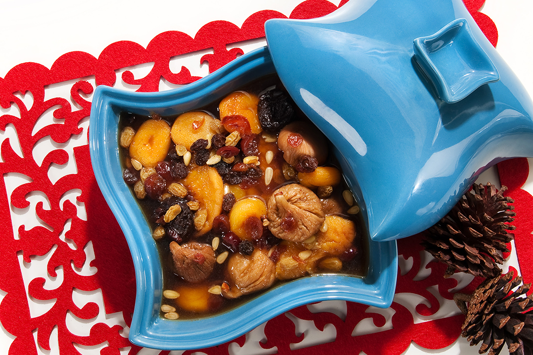 - Colocar los higos, albaricoques, ciruelas y uvas pasas, en un recipiente.