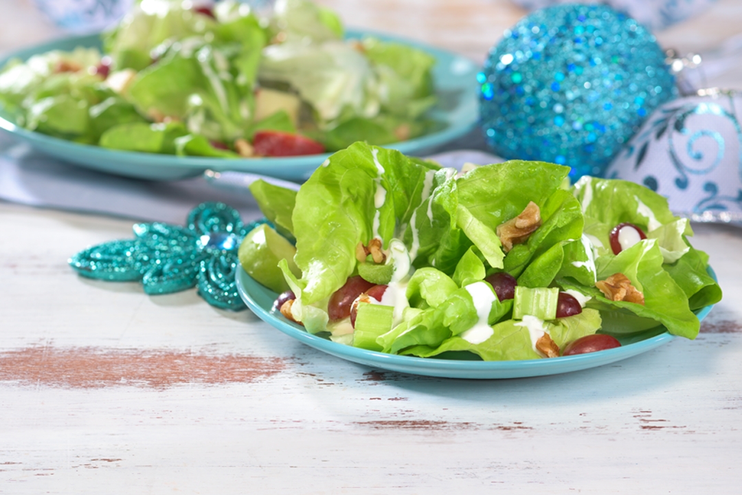 Para servir, colocamos en una fuente una porción(?) de lechuga troceada, vertemos encima la mezcla preparada de los demás ingredientes con la mayonesa, y finalmente decoramos con el resto de las nueces.