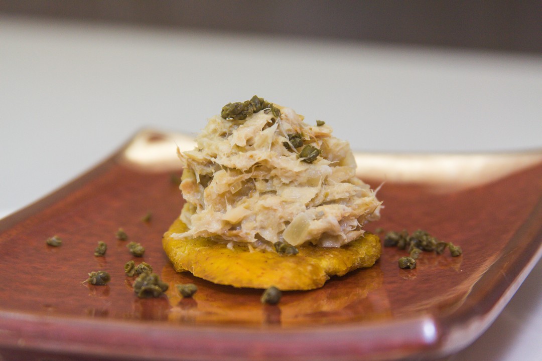 - Para el montadito: Colocar un tostón de plátano verde y luego colocar un poco del curry.
