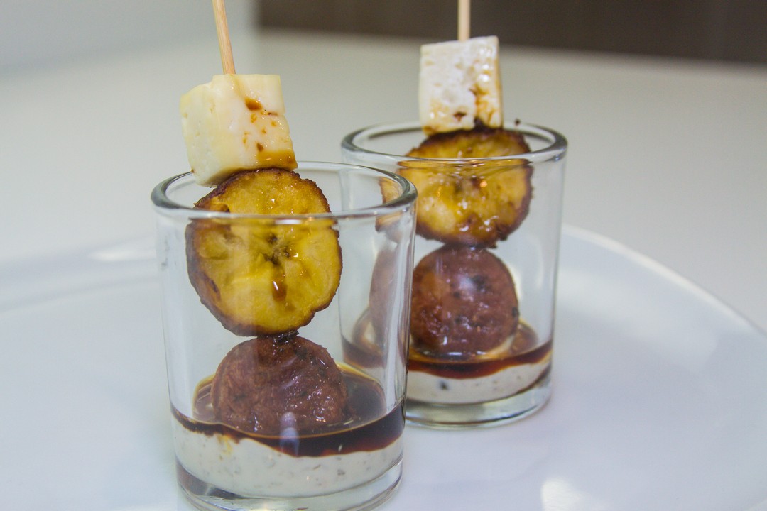 - En el palito colocar una rueda de plátano maduro, una rueda de longaniza y un cuadrito de queso de freír.