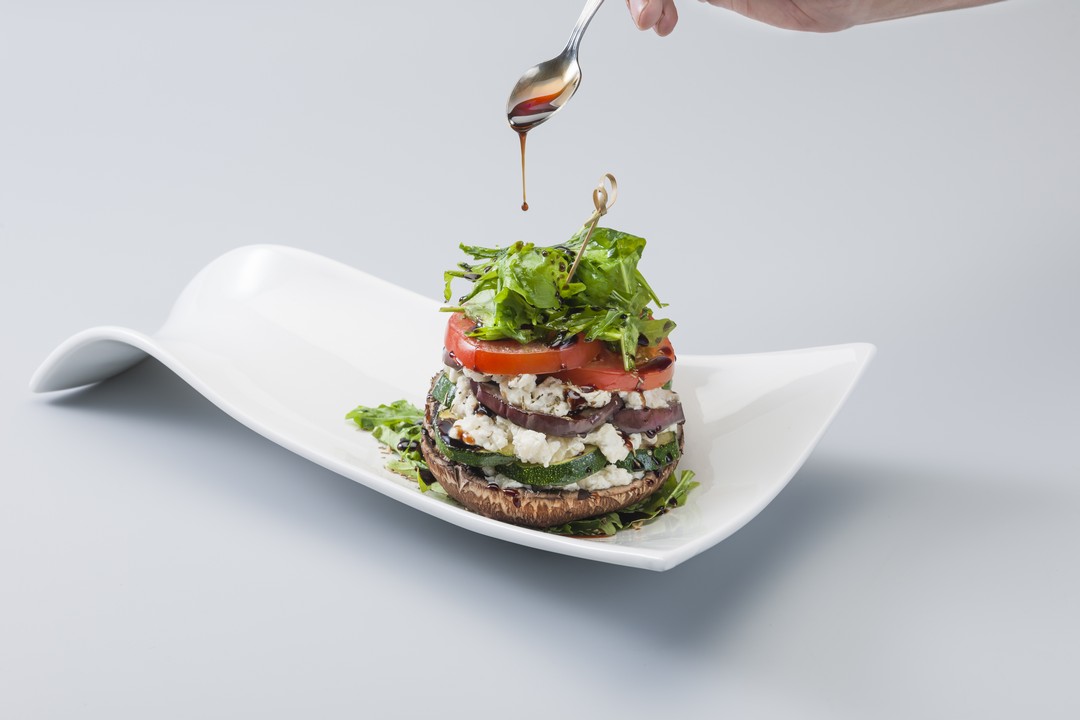 Rellenamos cada hongo iniciando con una cucharada de la mezcla de quesos, seguimos con láminas de zucchini, luego otra cucharada de la mezcla de queso, láminas de berenjena, otra cucharada de la mezcla de quesos, luego la rebanada del tomate y, por último, la ensalada de rúcula.