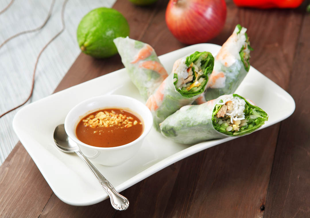 Colocar una hoja de arroz, sobre ella una hoja de lechuga y agregar un poco de la mezcla del repollo, cubrir con tiras de pepino, pimiento y puerro, más las hojas ( de cilantro, albahaca o menta enteras o picaditas) y enrollar.