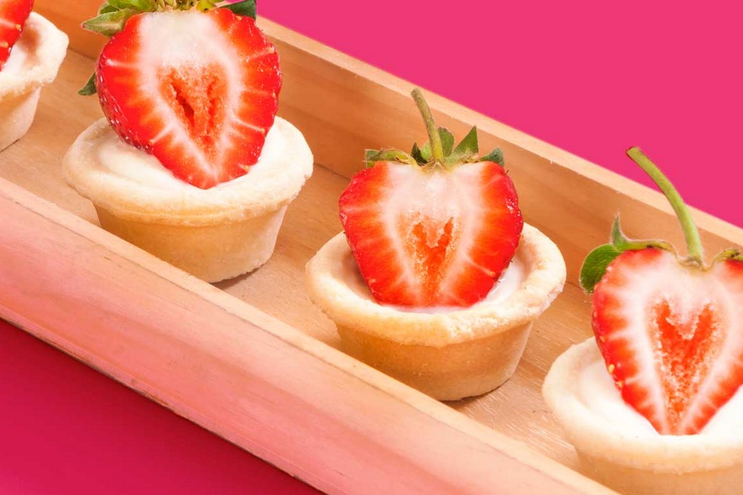 Una vez que refresquen, retiramos las tartitas de los moldes, las rellenamos con la crema pastelera* y colocamos una frutilla en cada una para decorar.