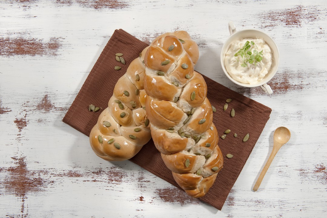 - Pintar la trenza con yema de huevo para darle brillo y color, y espolvorear con semillas de auyama tostadas.
