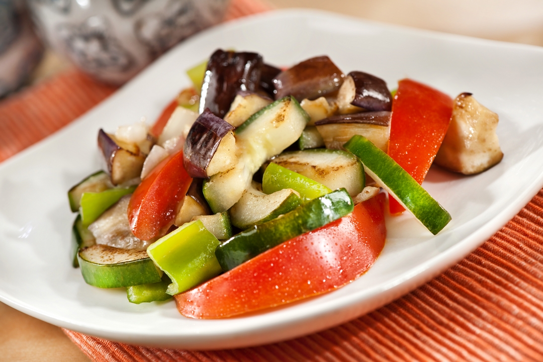 - En un wok con un chorrito de aceite de oliva colocamos la berenjena, zucchini y ají.
