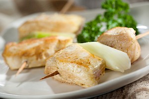 Brochetas de pollo y puerro
