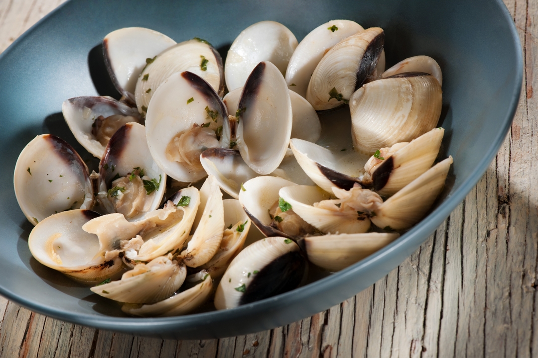 - Agregamos el vino, la hoja de laurel y las almejas, y cocinamos hasta que todas abran.