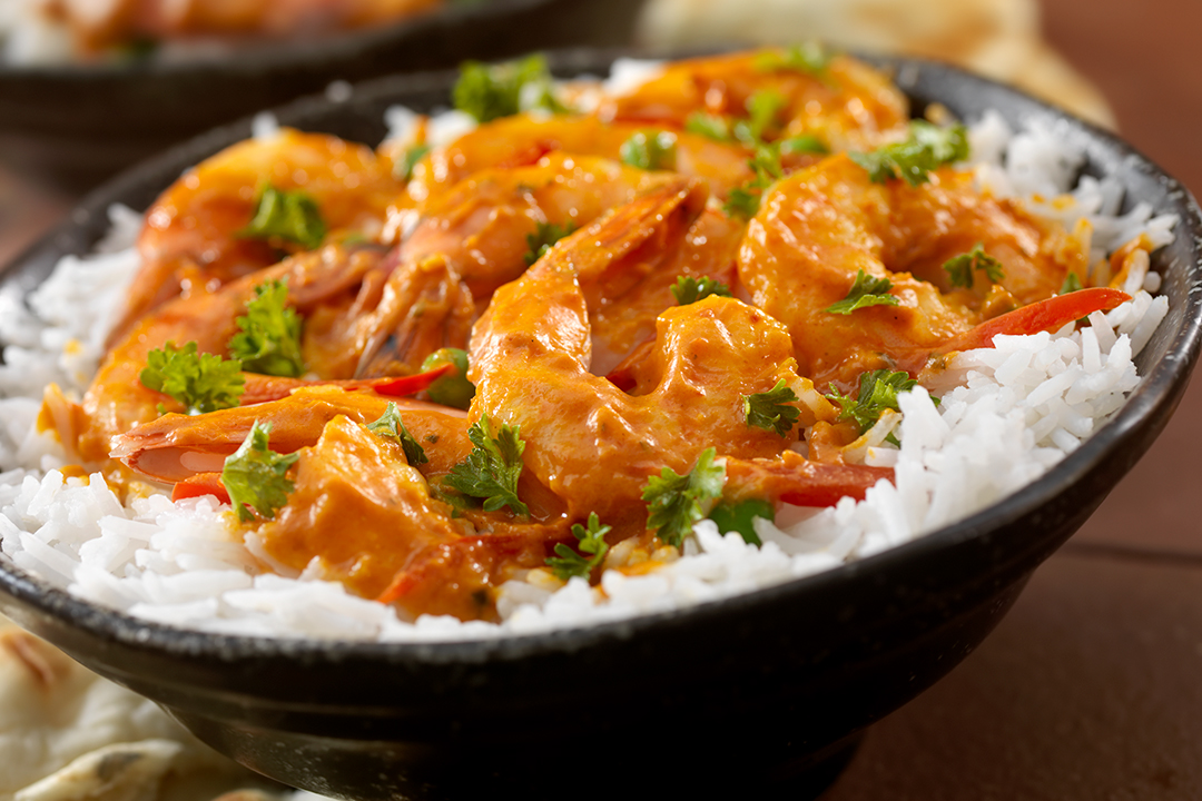 En una sartén sofreír en el aceite el ajo con el curry, luego colocar los camarones, el arroz y la sal.
