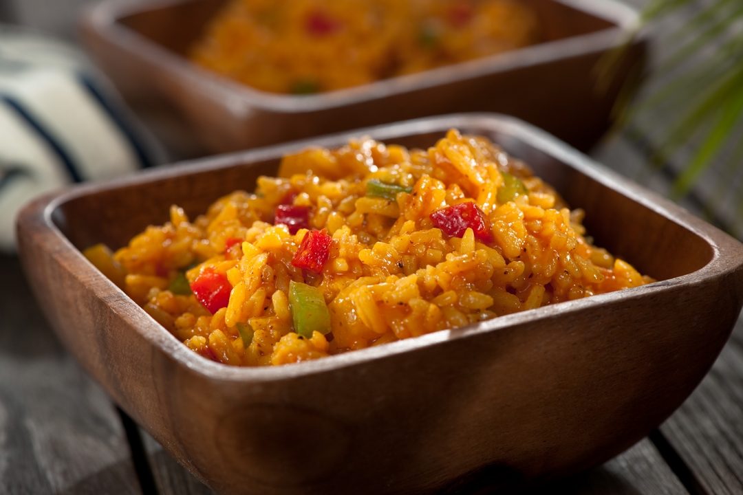 En un caldero sofreímos los pimientos y cebolla y agregamos la salsa condimentada, agregamos 1 taza de agua, cuando hierva agregamos el arroz y movemos bien para que se mezclen todos los ingredientes, dejamos cocinar por 5 minutos y agregamos la carne, el caldo de pollo y más agua hasta cubrir todo el arroz, dejamos hervir hasta que el arroz este cocido.