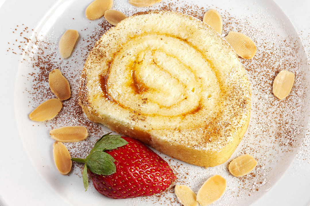 Ensamblaje: enrollar la masa fría con la crema pastelera. Decorar con azúcar pulverizada.