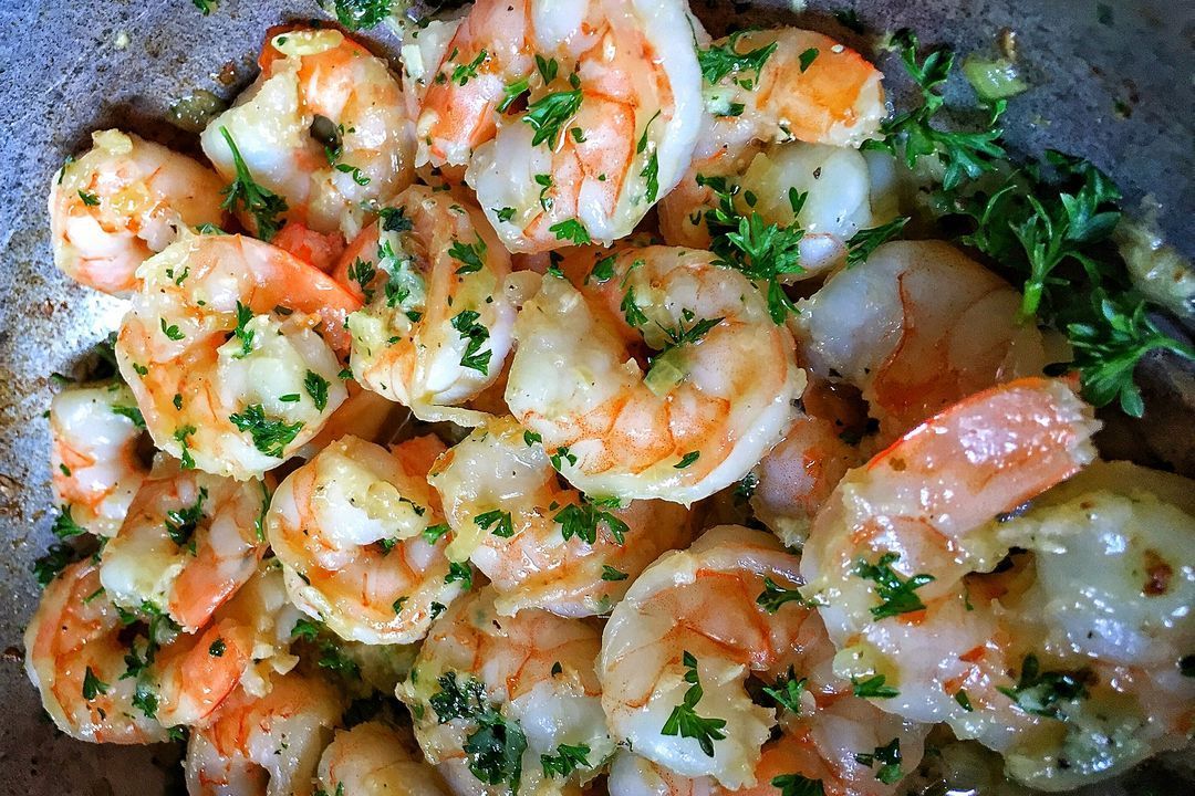 Verter en una sartén el aceite de oliva junto a la mantequilla, incorporar el ajo majado, la hoja de laurel y cocinar a fuego bien suave durante 2 minutos evitando que el ajo se queme. Subir el fuego y al mismo tiempo agregar los camarones. Cuando cambien de color añadir el vino y dejar que reduzca. Sazonar con sal y pimienta. Servir con el perejil.