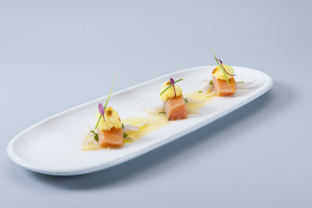 Presentar el ceviche en una copa o vaso corto y luego colocar la espuma de chinola encima.