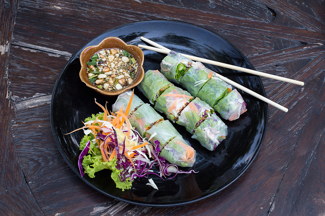 Coloque una hoja de arroz sobre ella una hoja de lechuga y agregue un poco zanahoria cubra con tiras de pepino y puerro, mas las hojas ( enteras o picaditas de cilantro, albahaca o menta ) y enrolle.