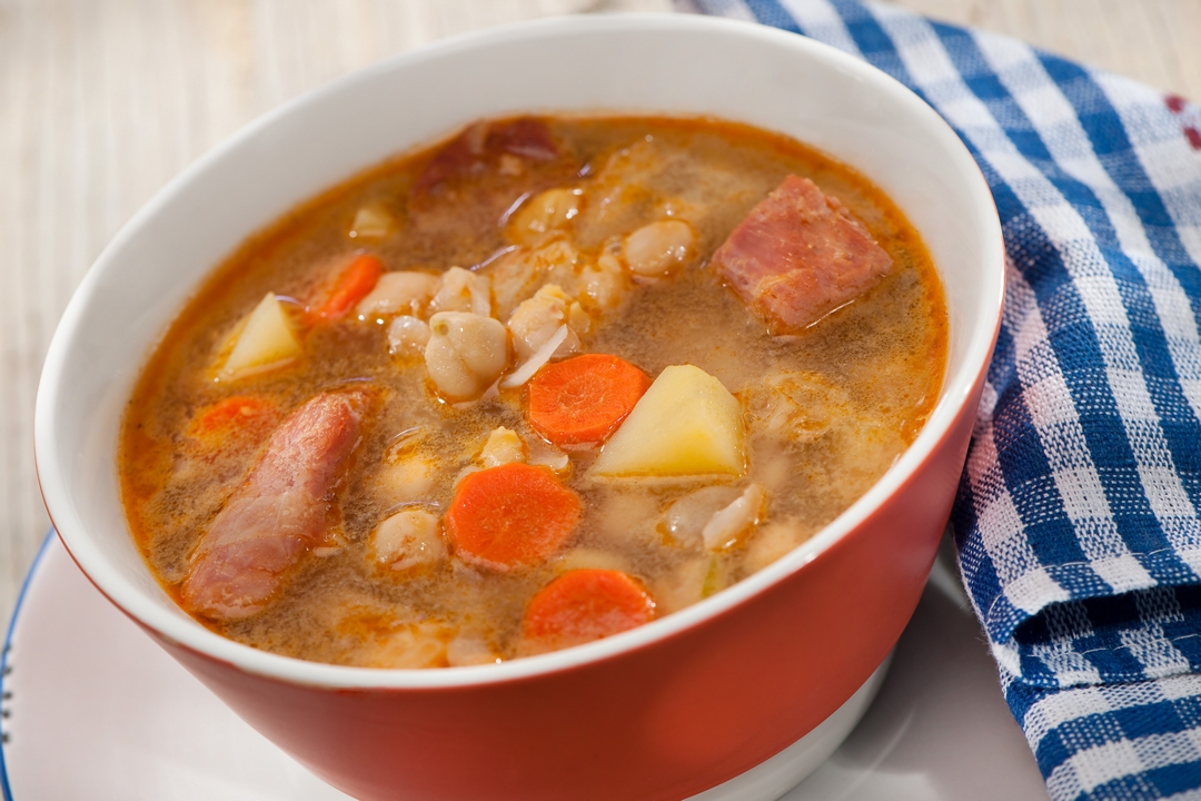 Aparte, unimos todas las carnes en una olla, añadimos los garbanzos, papas, zanahorias, comino y romero, y dejamos cocer hasta que las verduras estén blandas.