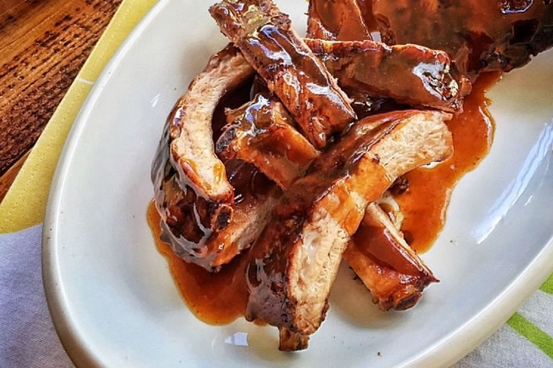 Retirar el papel y colocar la salsa en una sartén, llevar las costillas de nuevo al horno a 400 °F hasta que estén doradas. Verter la salsa a una sartén y dejar que se espese. Retirar las costillas del horno, colocarlas en un embace y cubrirlas con la salsa previamente colada.