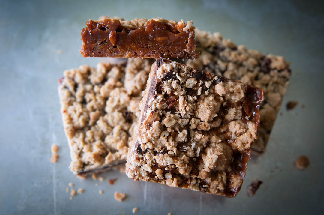 Precalentar el horno en 325 F. Poner en un procesador de alimentos la harina, la sal, el azúcar, avena y la mantequilla en cuadritos, procesar hasta que se compacte. Reservar 1/2 taza de esta mezcla para el final y mientras ponerla en el freezer (congelador) unos 20 minutos.