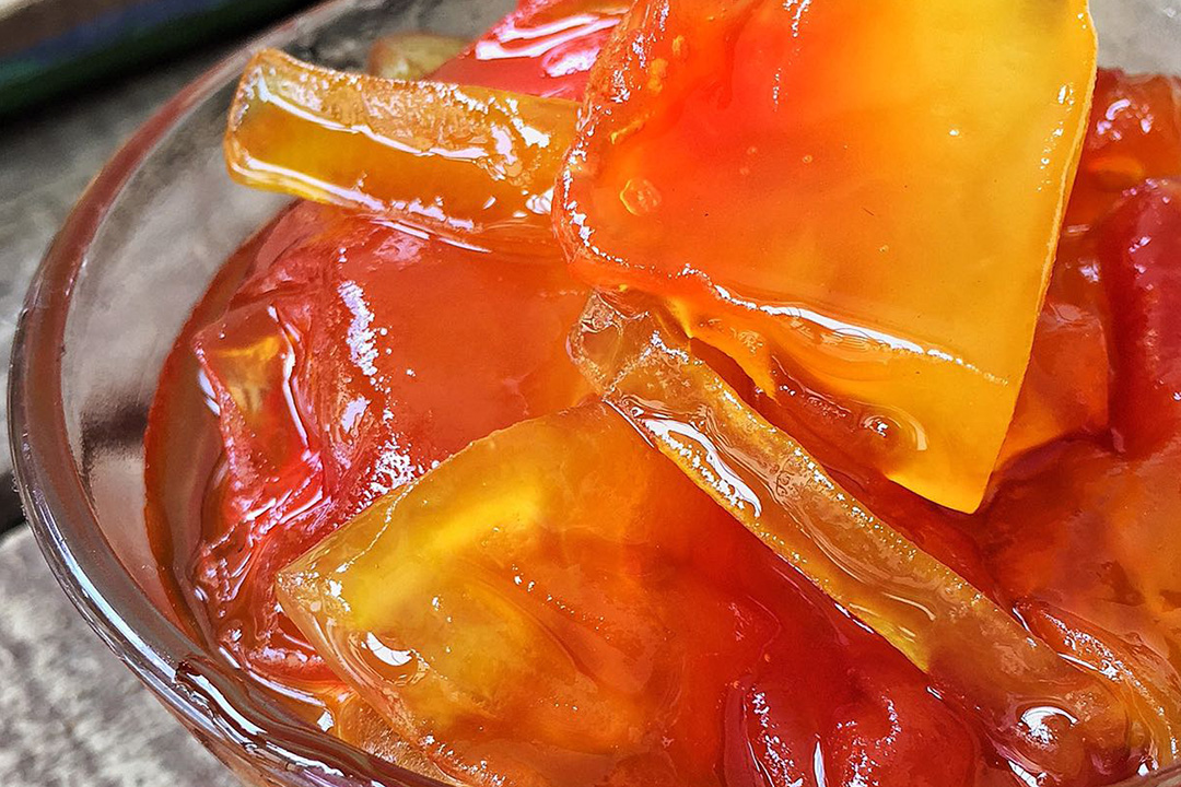 Escurrir la lechosa del agua, verter en el caldero donde se encuentra el almíbar y cocinar a fuego medio durante una hora hasta que el almíbar tome consistencia y las lonjas de lechosa cambien de color.