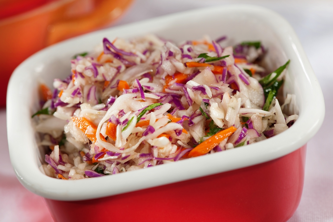 - 3 tazas de repollo morado y 3 tazas de repollo blanco cortados finamente