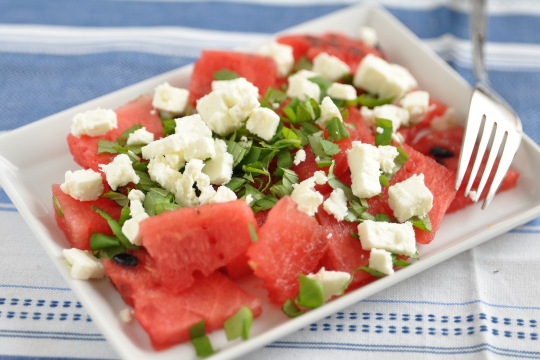 En una fuente combine la sandía, el zumo de limón y la mitad de la albahaca y la menta.