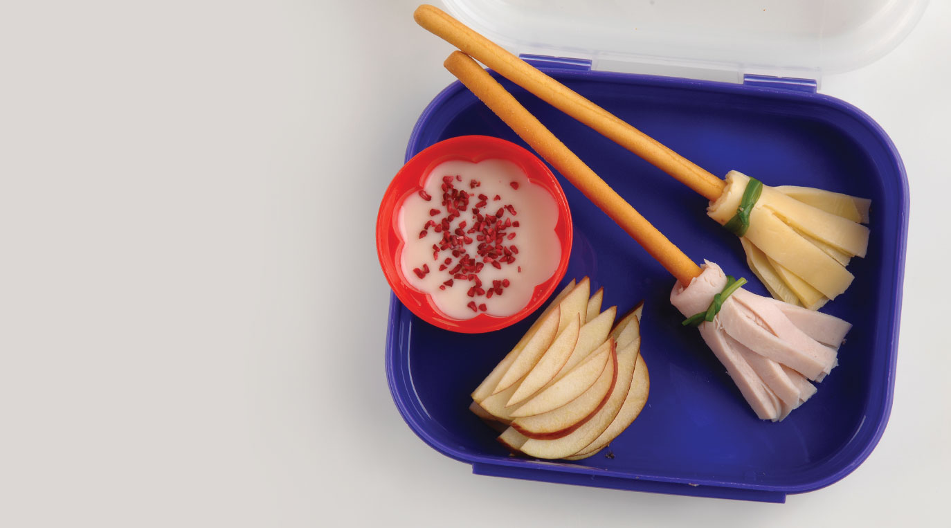 Escobitas de bruja Categoría Menú infantil Dificultad Fácil Porciones Ingredientes Palitos de pan o grissinis con queso y Jamón amarrados con tiras de puerro Manzana en lascas Yogurt Preparación