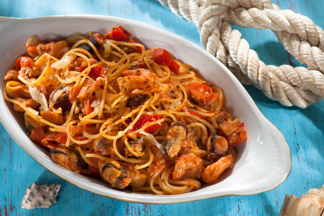 Espaguetis horneados con mariscos