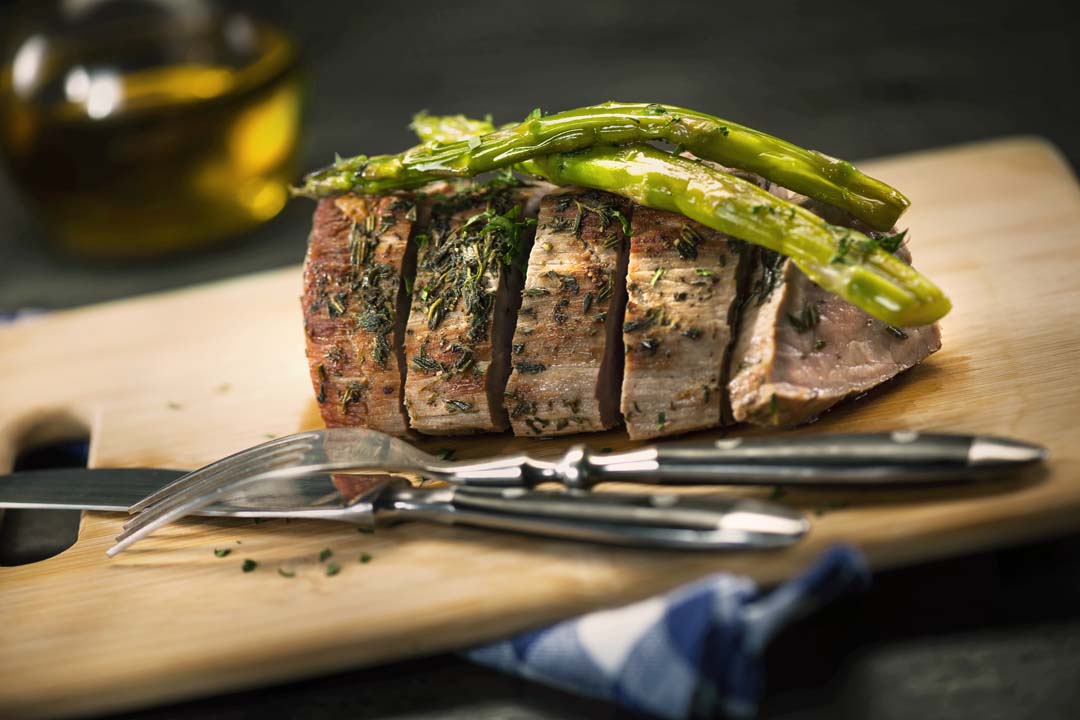 Ya reposado, laminamos el filete, le colocamos por arriba los espárragos y, opcional, unas gotas de aceite de trufas.