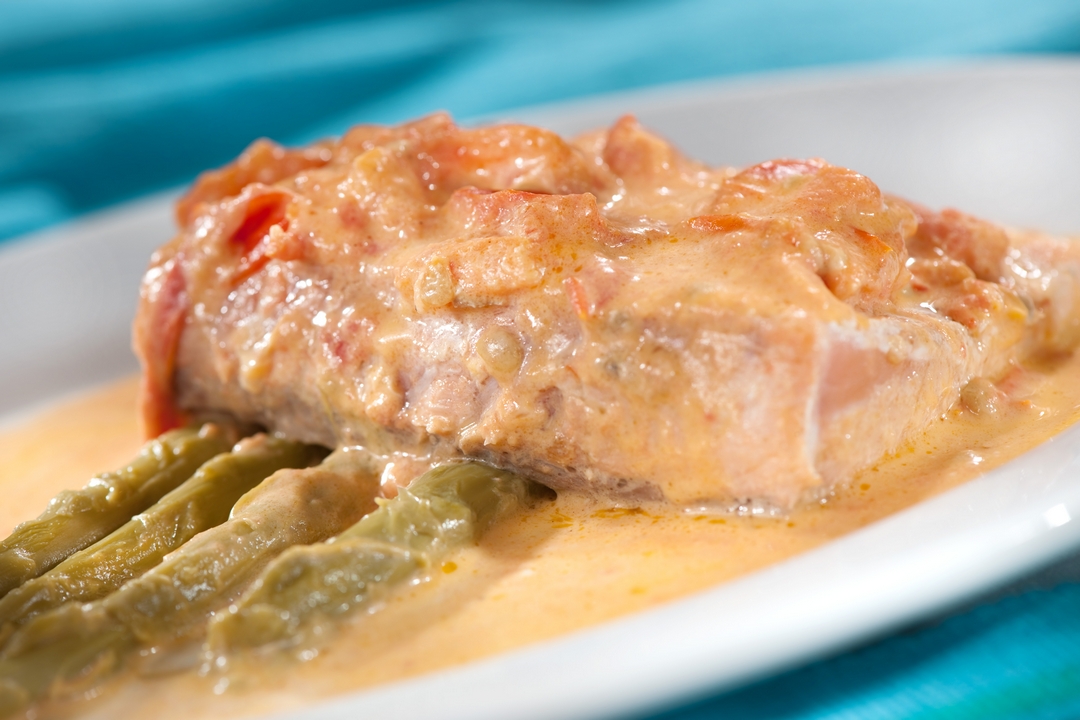 - Colocamos los espárragos en un pyrex y encima los trozos de salmón sazonados con ajo, pimienta y sal.