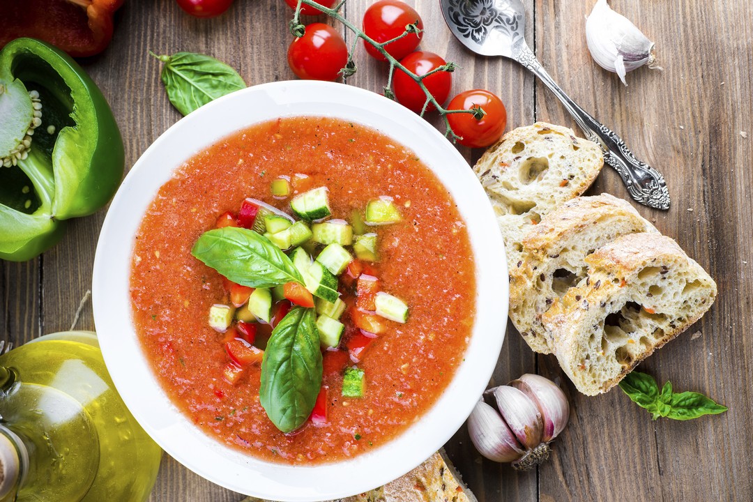 Se sirve con una guarnición de pepino crudo cortado en dados, cuadritos de pan (normal o tostado), pimiento cortado en cuadritos y cebolla picada. Cada elemento en un platito aparte para que los comensales puedan servirse a su gusto.