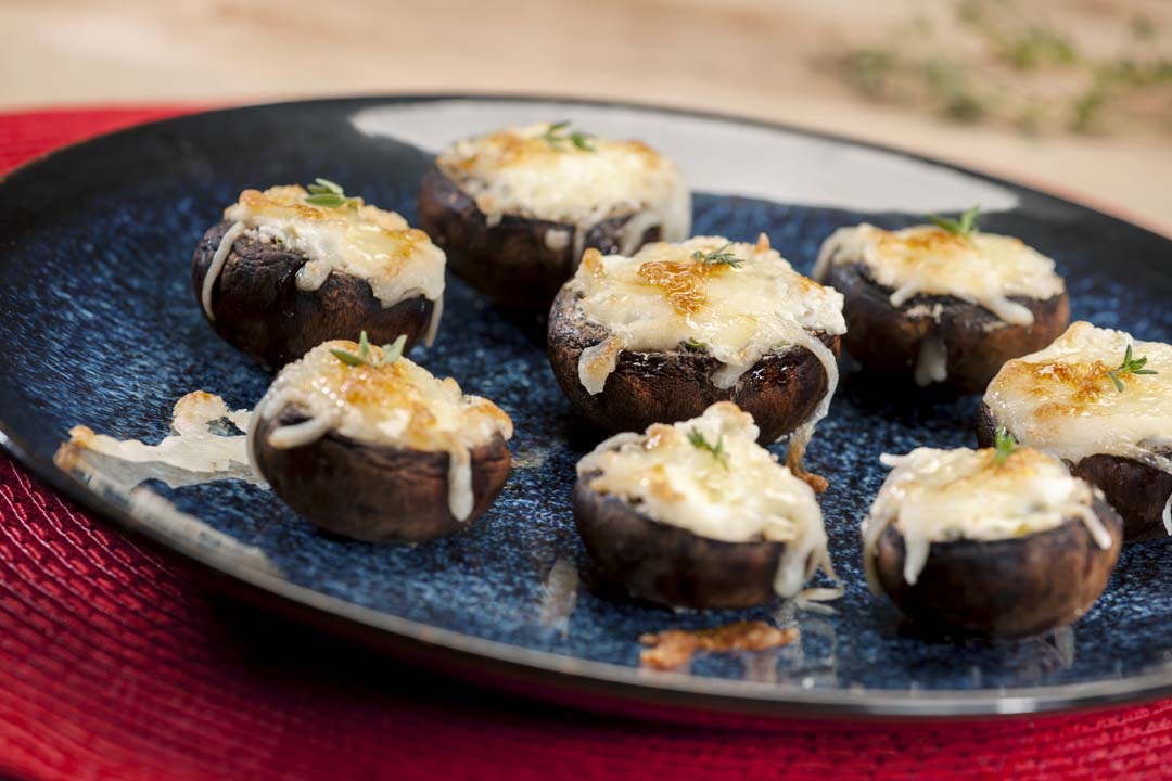 Tomar cada hongo individual y rellenar el hueco con la mezcla de quesos. Volver a colocarlos en la bandeja y rallarles queso parmesano por arriba.