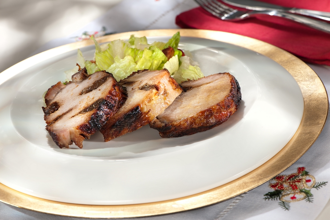 - Mechar el lomo, salpimentar y rellenar con las ciruelas, el puré de manzana y el puré de batata.