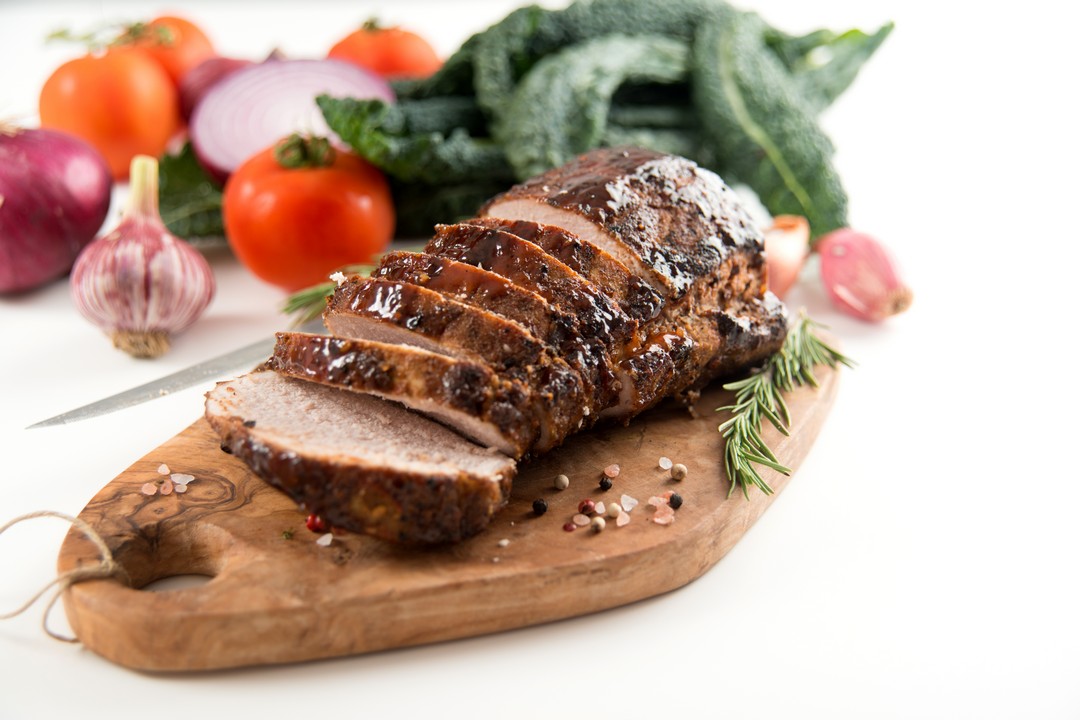 Cuando la salsa esté, colocar el lomo en un platón, verter la salsa sobre las ruedas de lomo, y colocar un poco de tomillo y las lascas de almendras por encima.