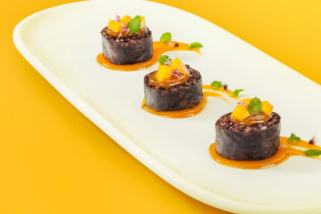 Rectificar el sazón, si hace falta añadir un poco más de azúcar o sal. Para montar, colocar las ruedas de pan francés en un plato, colocarles encima las ruedas de morcilla y colocar arriba de la morcilla chutney de mango.