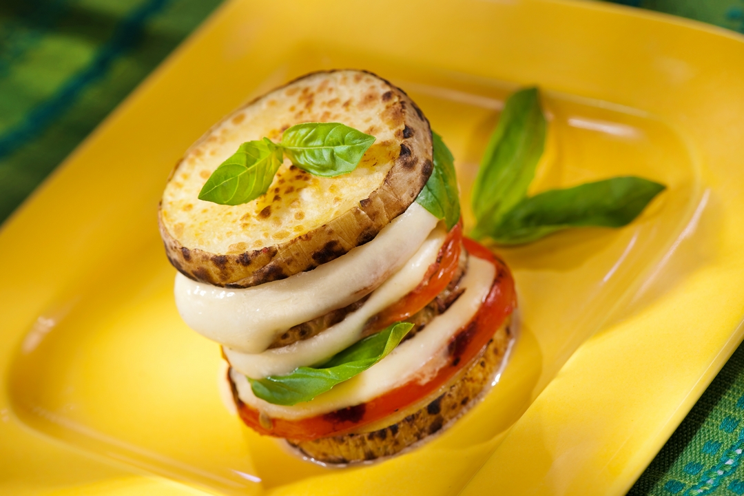 - Vamos intercalando papas, tomates y queso, y colocamos entre ellas algunas hojitas de albahaca.