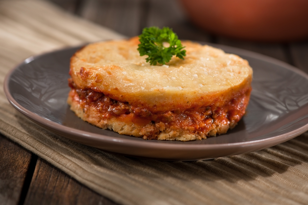 En un molde colocamos la mitad de las hojas de plátano y agregamos la mitad de la masa, ponemos una capa de la carne y la mitad del queso, luego la otra mitad de la masa y la carne restante, terminamos con la otra parte del queso mozzarella y cubrimos con el resto de las hojas de plátano.