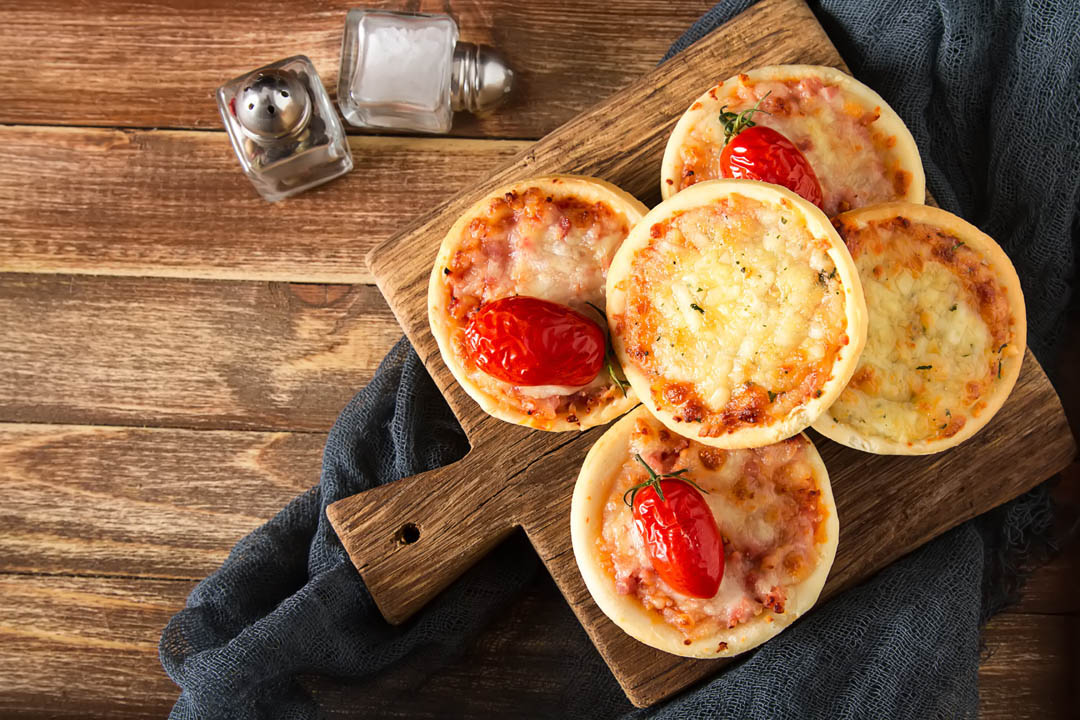 Rellenar las pizzitas con la salsa de pizza y por arriba colocar en partes iguales el queso cheddar y el mozzarella.