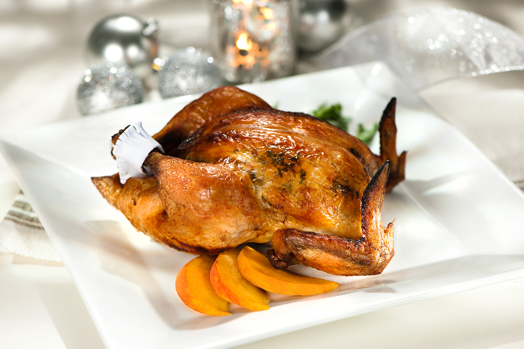 - Separe la piel del pollo e introduzca la mantequilla con estragón, luego sujete las patas del pollo y frote el mismo con la miel de maple.