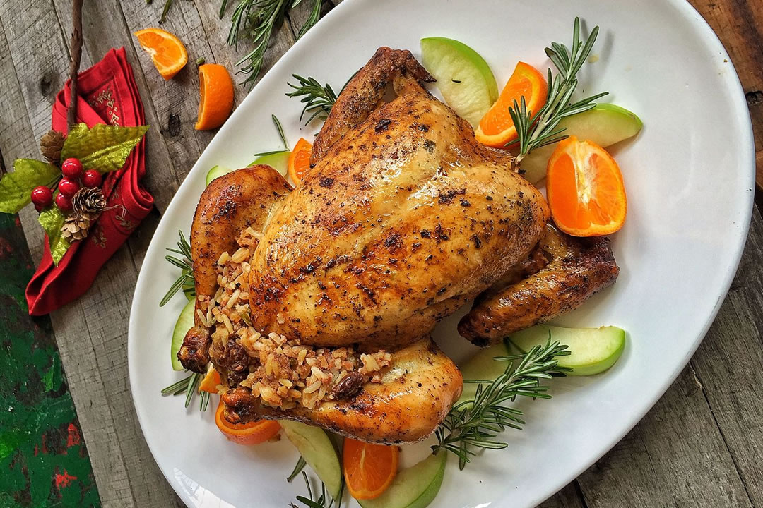 - Aparte, combinar el resto de los ingredientes, colocar dentro de la cavidad del pollo, sujetar con palitos y amarrar.