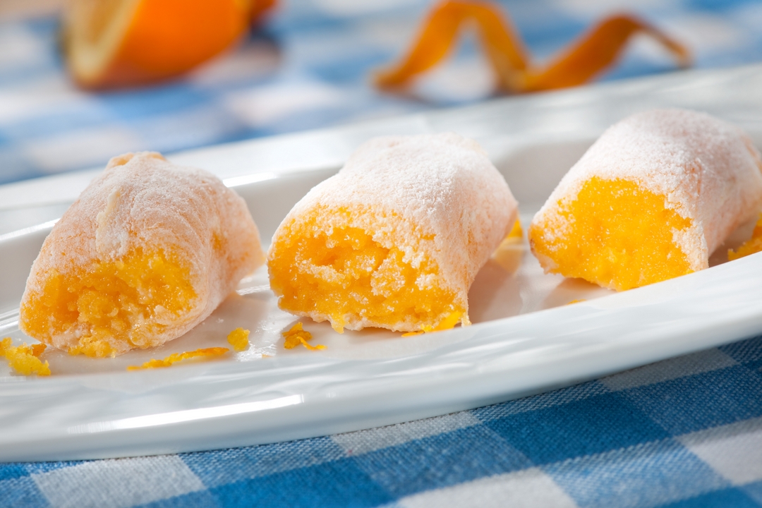 - En una olla hacemos el almíbar calentando el agua con 4 cucharadas de zumo de naranja, las cáscaras y el azúcar.