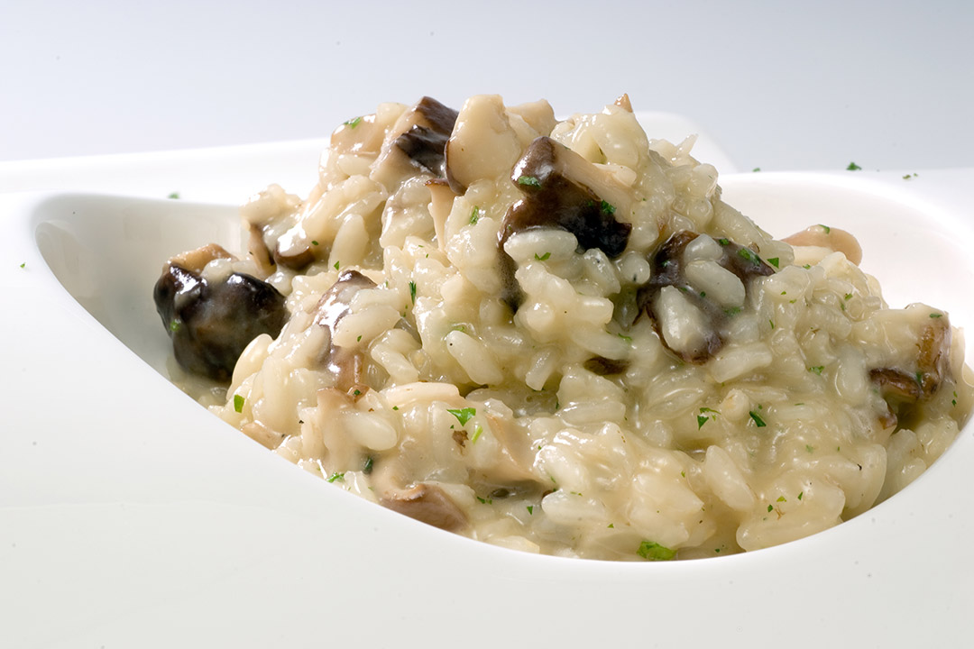 En una olla colocar la mantequilla, la cebolla picada y el ajo. Dejar cocer hasta que estas ablanden, agregar el arroz, dejar dorar y dar un toque de sal y pimienta. Luego incorporar el vino y dejar evaporar por lo menos unos 2 minutos.