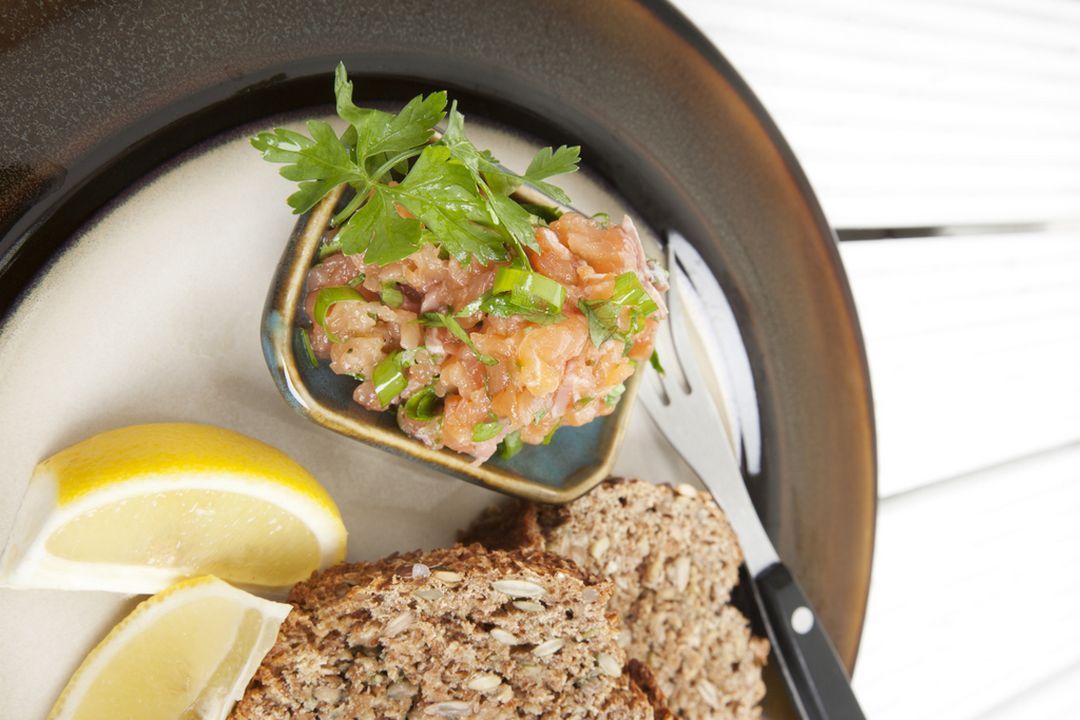 También puede colocar la salsa de mostaza y mayonesa sobre las tostadas y servir el salmón picadito, solo aderezado con sal y pimienta y un toque de limón, por arriba.
